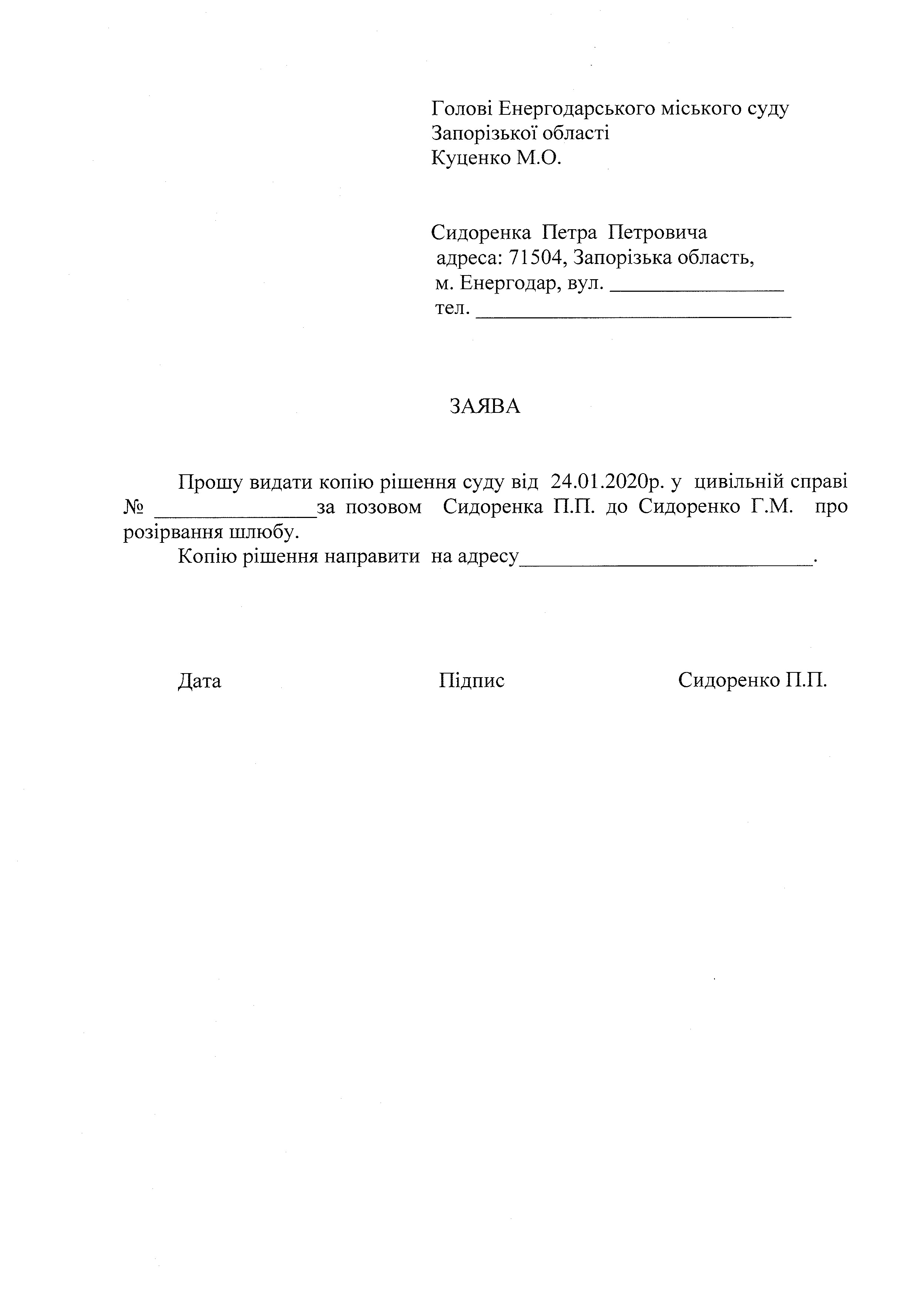 Заява про видачу копії рішення про розірвання шлюбу